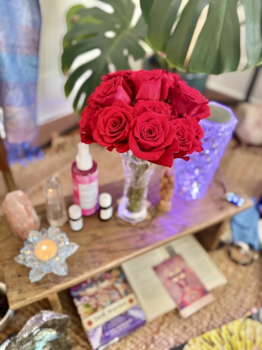 Flowers — Depending on the season, I may bring in flowers from my garden. I especially love bringing red roses, the traditional flower of psilocybin journeys, symbolizing the heart chakra, love and compassion.